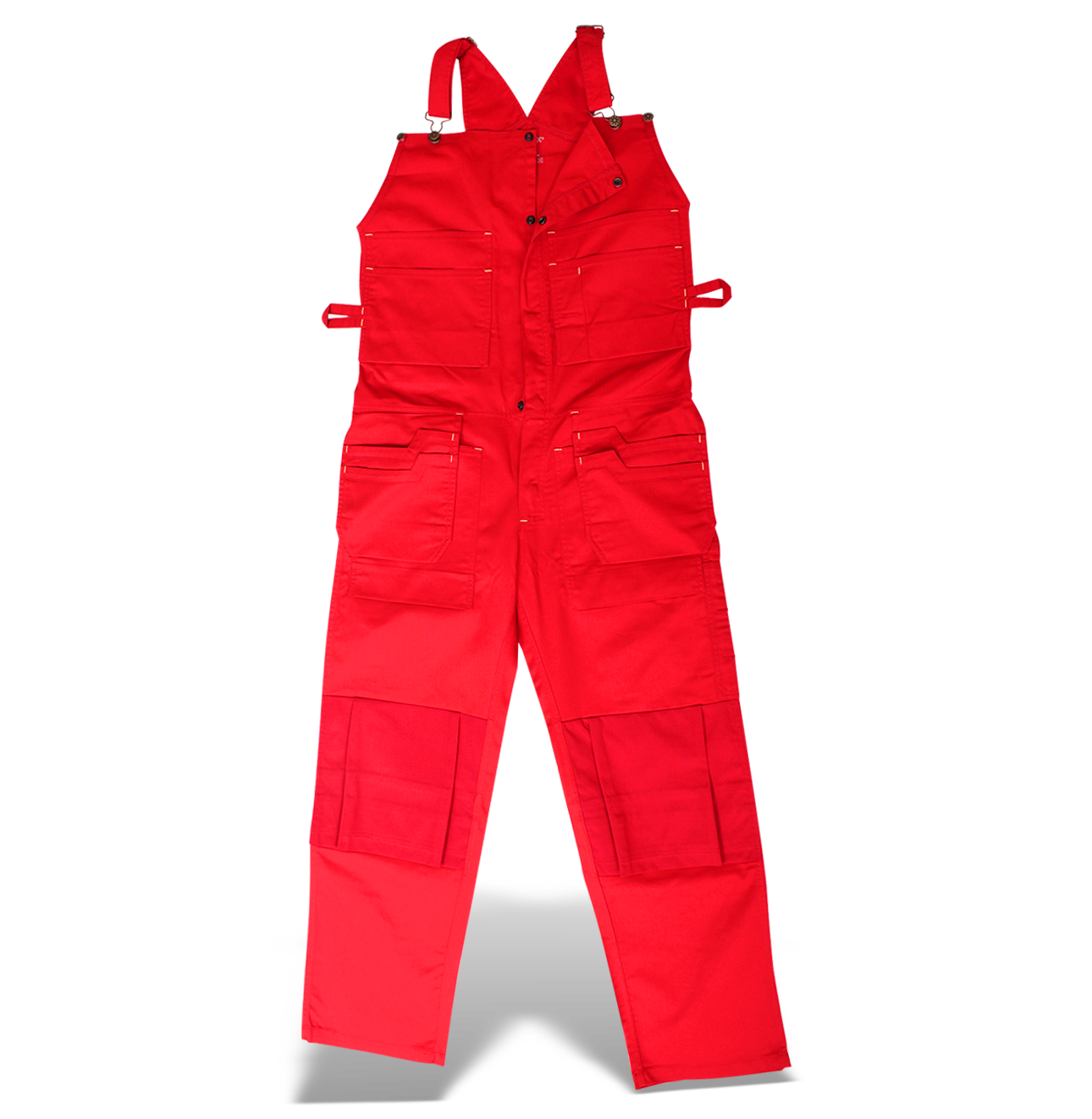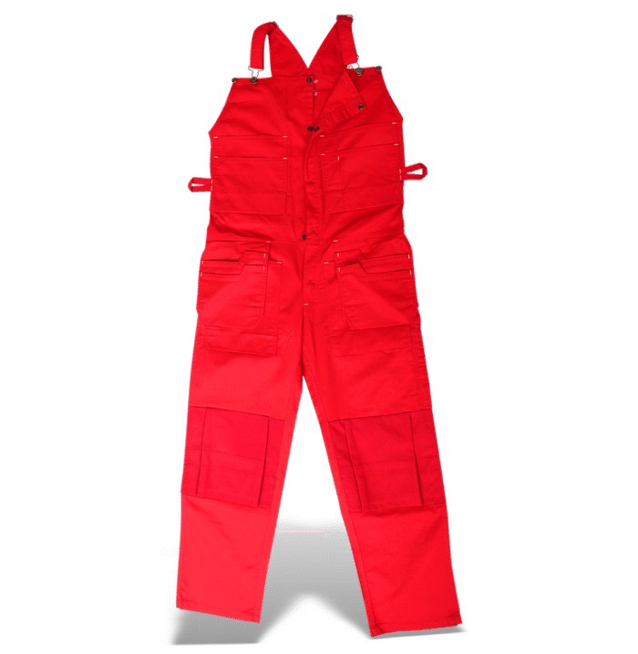 breast pockets, safety straps, hammer loop, two free pockets at the front, leg knees with extra padding against rigurous